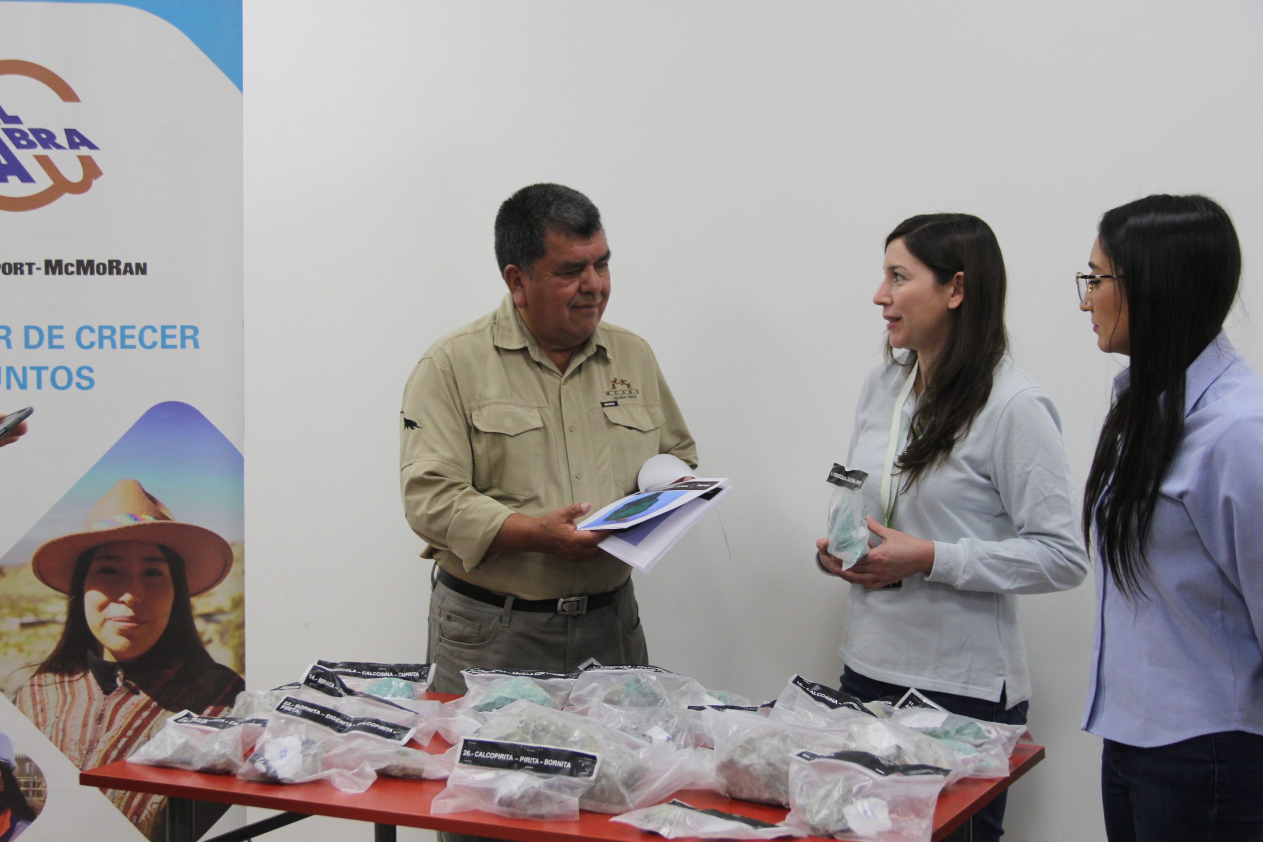 Minera El Abra donó 28 muestras de minerales al Museo de Historia Natural y Cultural del Desierto de Atacama de Calama que incluyen ejemplares de crisocola, pirita y otras rocas seleccionadas por el equipo de geología de la compañía.